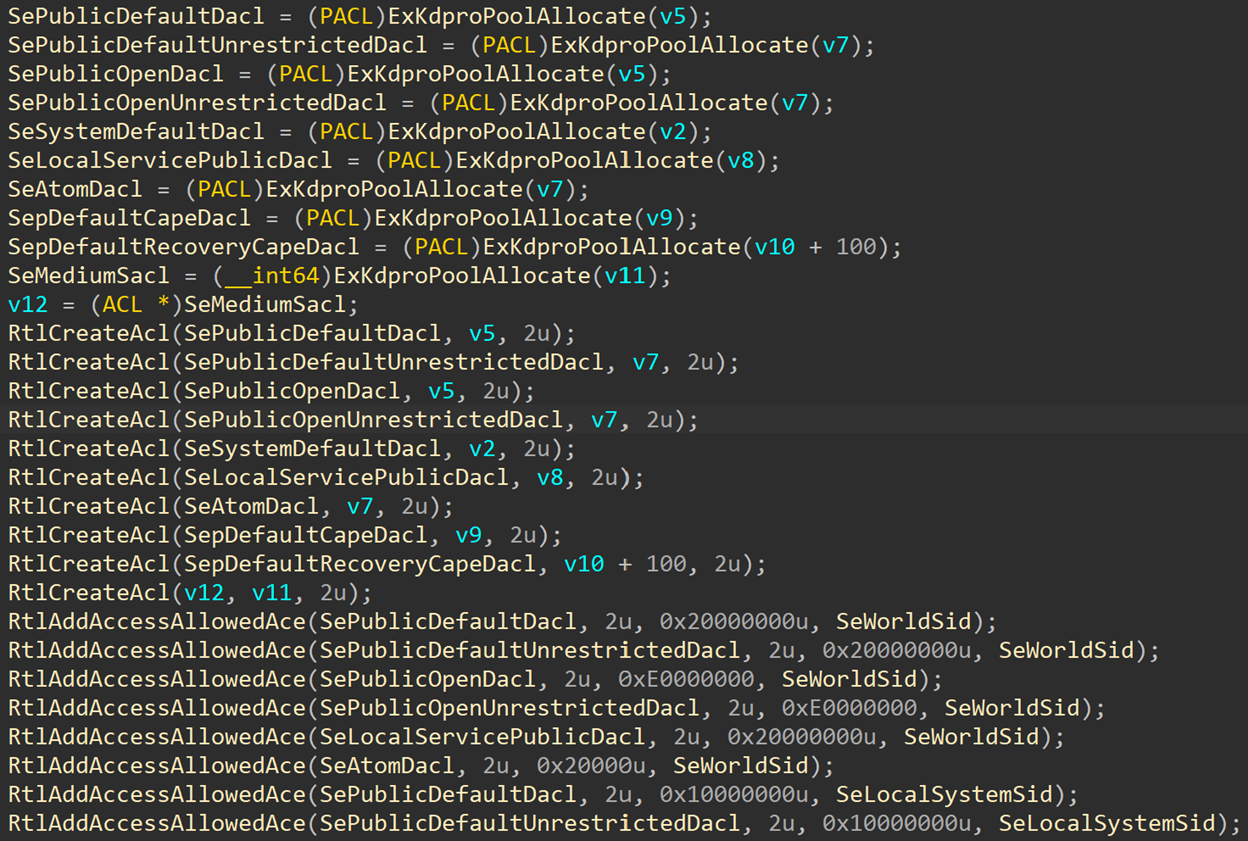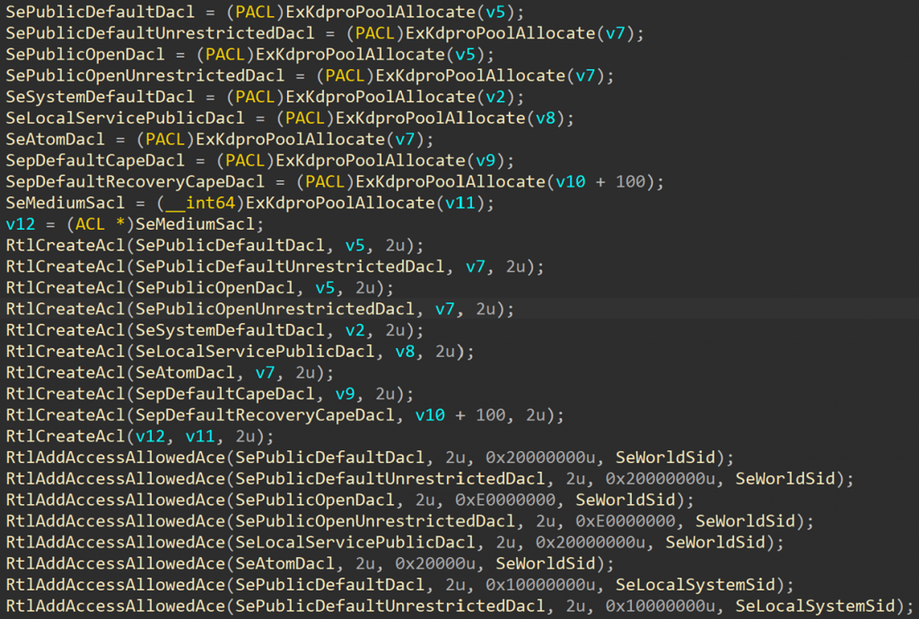 To protect from these types of attacks, the security library moved SeDebugPrivilege and many other variables to the KDPRO section. Default ACLs, such as SePublicDefaultDacl, SeSystemDefaultDacl and SeMediumSacl, that have a size which is not known at compile time, get allocated during boot using ExKdproPoolAllocate. SIDs (well known, user SIDs, trust SIDs and capability SIDs) also get allocated in the KDP pool and pointed to by variable in the first page of the KDPRO section.