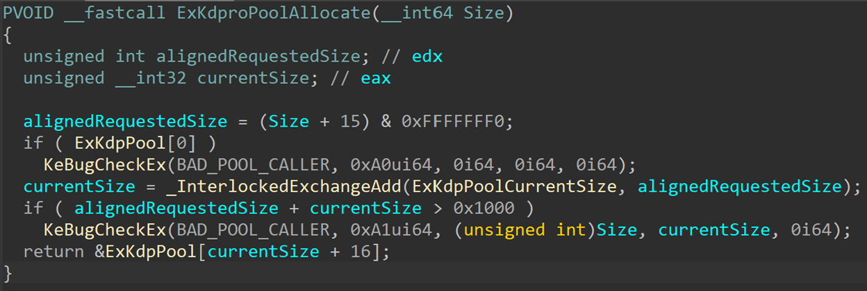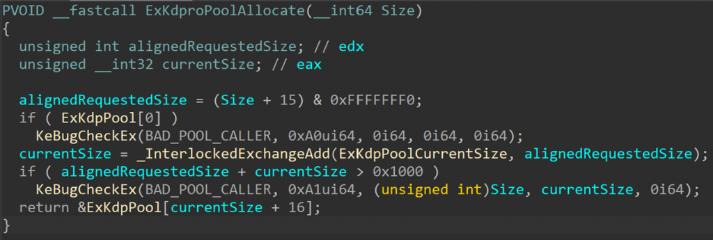 Since this is not a real pool, allocation is much simpler than “real” pool allocations. ExKdproPoolAllocate receives the requested size, aligns it to 0x10 and adds it to ExKdpPoolCurrentSize, which always stores the number of bytes currently allocated in the KDP “pool”. The current limitation is that the total number of allocated bytes must be less than 0x1000. The function returns a pointer to the end of the last block allocated in the “pool” (the first allocation is at ExKdpPool + 0x10, so 0x10 bytes are always added to the current byte count).